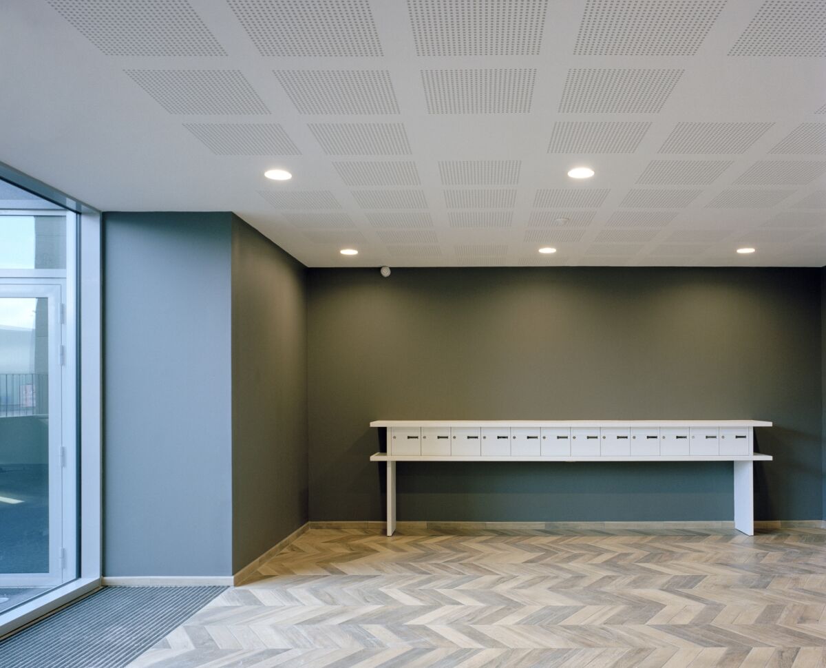 Situé à l’intersection de plusieurs axes majeurs de Lyon, le siège de la Confédération de l’artisanat et des petites entreprises du bâtiment inscrit sa longue façade de béton poli noir dans une séquence urbaine rectiligne. L’extrémité nord de cet ensemble tertiaire de 12 000 m2 s’affine en une proue expressive et tranchante. L’édifice est fragmenté en cinq grands volumes décalés et rythmé par deux césures. Ce jeu de forme rompt la linéarité, dynamise la composition et amène plus de lumière naturelle dans les espaces de bureaux. Grâce à cette découpe et aux variations de hauteurs, le monolithe de 80 m de long ne paraît jamais massif. Largement ouvert sur l’extérieur, le socle accueille des commerces. Les nombreuses fenêtres verticales positionnées à fleur de peau du béton soulignent la rigueur de la composition architecturale. Débarrassées de tout équipement technique et végétalisées, les toitures sont traitées comme une cinquième façade. Leurs parties basses peuvent accueillir le personnel pour des moments de détente, tout comme le belvédère panoramique qui trône au sommet de la proue de cette nouvelle vitrine de l’artisanat du bâtiment.